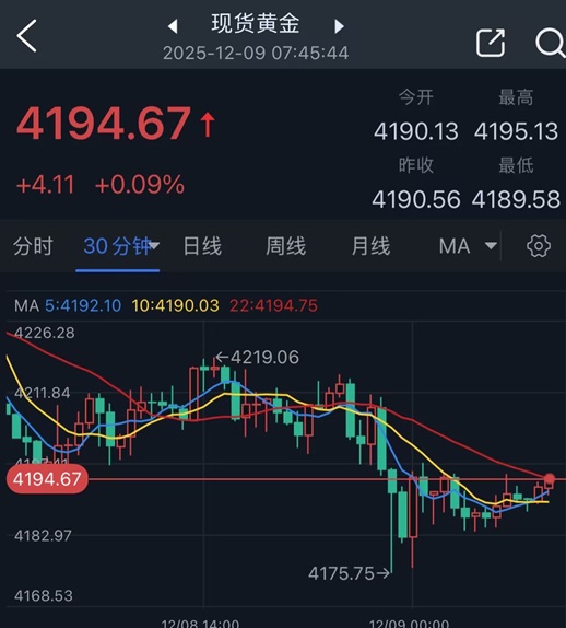 截至周一收盘,现货黄金下跌近0.2%,报4190.56美元/盎司,金价日内高点接近4220美元/盎司。