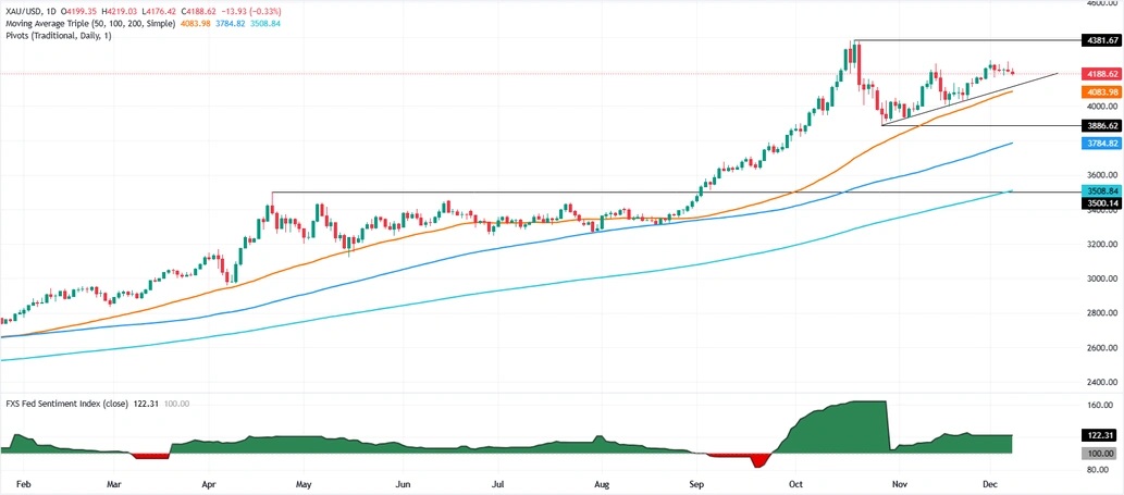 Valencia指出,黄金的上涨趋势依然完好,但买家未能将现货价格维持在4200美元/盎司上方,这可能为价格下探打开空间。相对强弱指数(RSI)显示,看涨动能有所减弱,目前该指数趋于平稳,表明在FOMC决议公布前,买家情绪有所疲软。
