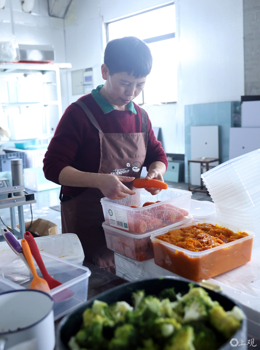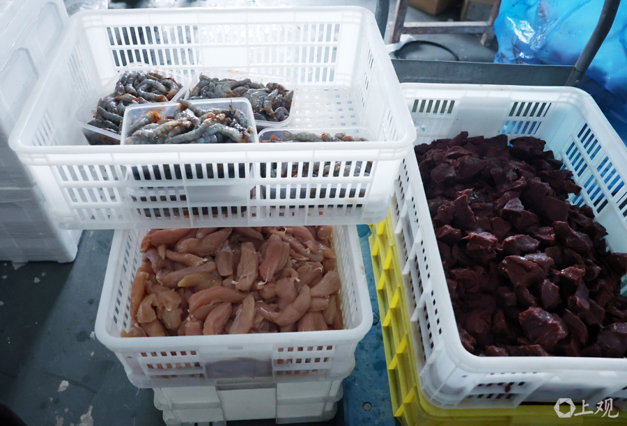 林美芳和金鑫在为神仙鱼制作食物。 业内普遍投喂“牛心汉堡”——以牛心、虾肉为主料,辅以维生素、酵母、燕麦粉等配制而成。
