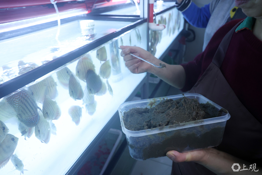 林美芳在为七彩神仙鱼配饲料辅食,不仅吃荤,还得吃素,荤素搭配。