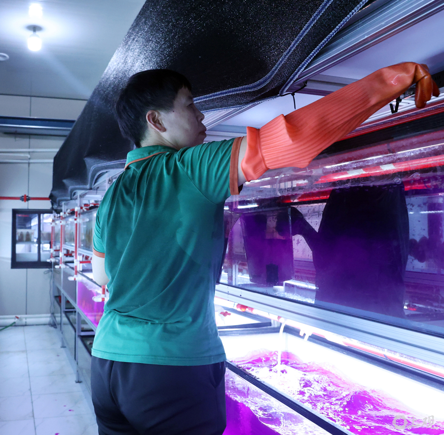 七彩鱼养殖繁育车间高温高湿,饲养员林美芳半小时左右后背便湿透。