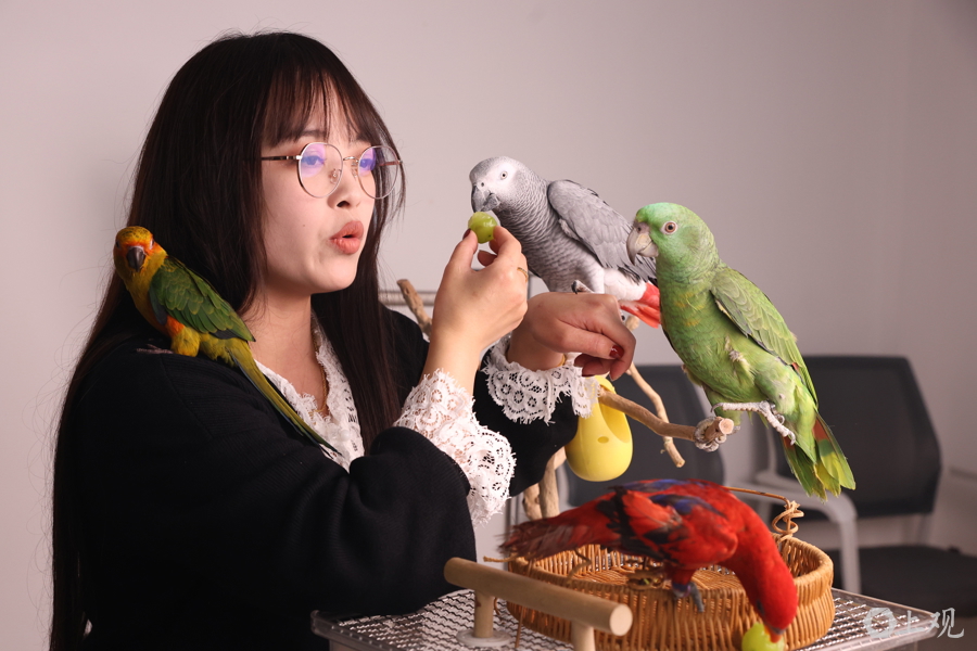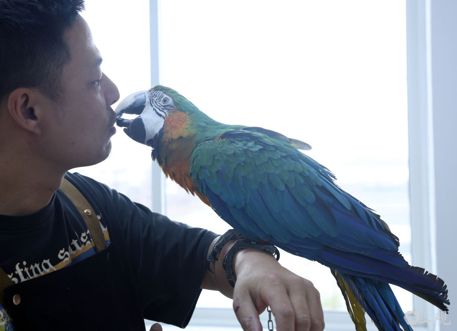 嘴对嘴喂瓜子——养殖人员和鹦鹉非常默契。