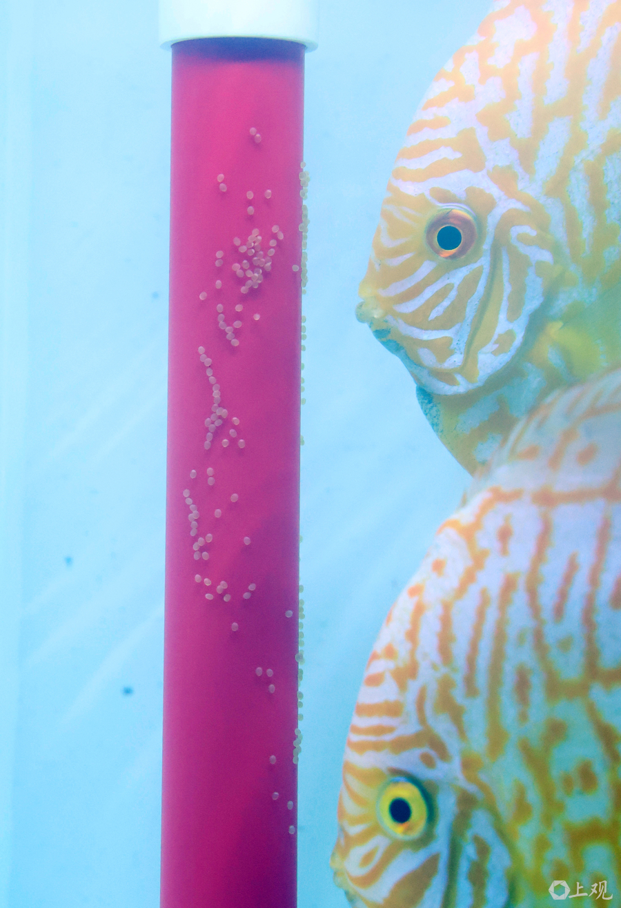 七彩神仙鱼产卵。雌鱼产卵后由雄鱼受精,一次可产100-500粒卵;亲鱼有护卵习性。