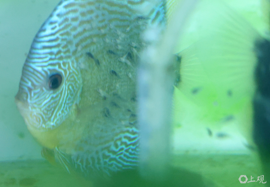 七彩神仙鱼繁殖成功,亲鱼护佑小鱼形影不离。